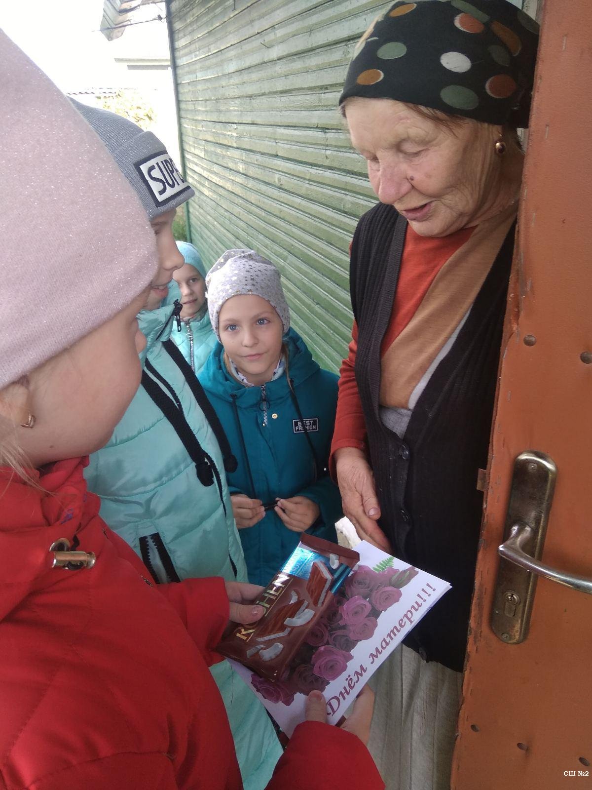 Накануне Дня матери тимуровцы отряда "Забота" учащихся 5 "В" класса посетили своих подопечных Рекеть М.А. и Кречко М. И., чтобы поздравить их с праздником. Ребята вручили женщинам открытки и сладкие подарки